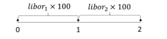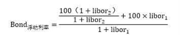 要算浮息债的价值,就是未来现金流求和,在这里不能把2时刻的现金流直接折现到0时刻,因为在0时刻投资者不知道投资者2时刻支付的现金流是多少,投资者只有在1时刻才能知道,所以,直接计算期初价值是不现实的,投资者在计算浮息债价值的时候,要用一个迂回的方式,先折到1时刻,在1时刻的时候投资者可以知道1-2时刻的利率,再加上1时刻的利息现金流,再折到0时刻,所以浮息债的价值计算,是用先折一期再折一期的方式计算出来的,一般用一般复利来进行计算。假如说投资者现在要计算浮息债0时刻的价值,浮息债的价值:如下