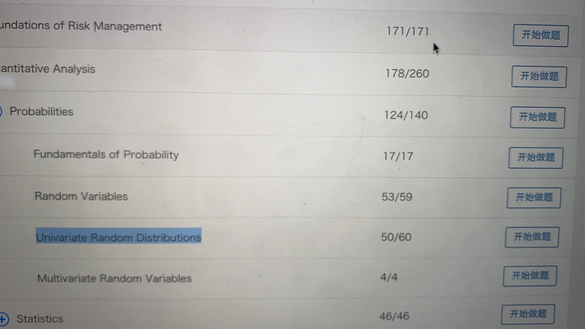 frm题库,2021,基础题库。Random Variables,和Univariate Random Distributions。各有10道题电脑显示不出来,手机可以,就是电脑里答题你全答完了发现还是50/60 。你懂我意思吧,看那个图。但是手机里进去就有了那些题。再就是你截图的那个地方,很多视频并没有题,它是空的,你至少随便放几道,不然看完视频下一步就没了,出错了。
