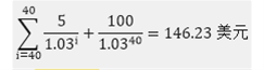 假定某债券的息票率为年率10%,期限为20年零2个月。为了计算转换因子,假定债券期限为20年,在6个月后第一次付息。因此息票被假定为每6个月支付一次,直到20年后支付本金为止。假定面值为100美元。当贴现率为年率6%(每半年复利一次),即每6个月为3%,债券价格为图1