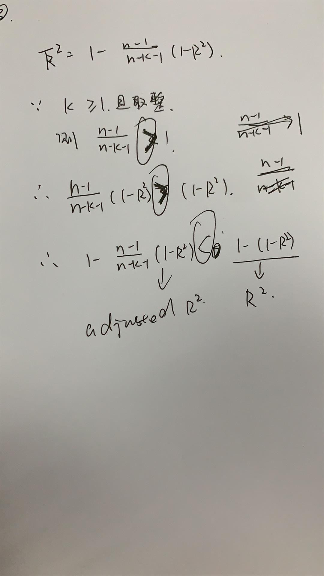 同学你好,这个问题是这样的,在附图的证明里可以看到,只有在k=0的时候,adjusted R方和R方才会想等。那K等于0是什么情况呢,就是回归中没有解释变量,比如Y=2, 这其实已经不叫回归了。所以一般来说线性回归中调整后的r方是会小于r方的,但写直接写小于也不是那么严谨。真题里是会遇到,比如四个选项选对的,但从严谨的角度来看,四个其实都有瑕疵,这个时候就不得不选一个相对比较正确的。这个没办法避免,要提前适应的。