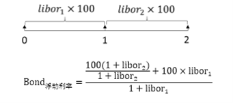 要算浮息债的价值,就是未来现金流求和,在这里不能把2时刻的现金流直接折现到0时刻,因为在0时刻投资者不知道投资者2时刻支付的现金流是多少,投资者只有在1时刻才能知道,所以,直接计算期初价值是不现实的,投资者在计算浮息债价值的时候,要用一个迂回的方式,先折到1时刻,在1时刻的时候投资者可以知道1-2时刻的利率,再加上1时刻的利息现金流,再折到0时刻,所以浮息债的价值计算,是用先折一期再折一期的方式计算出来的,一般用一般复利来进行计算。假如说投资者现在要计算浮息债0时刻的价值,浮息债的价值:所以最终算出来就是100