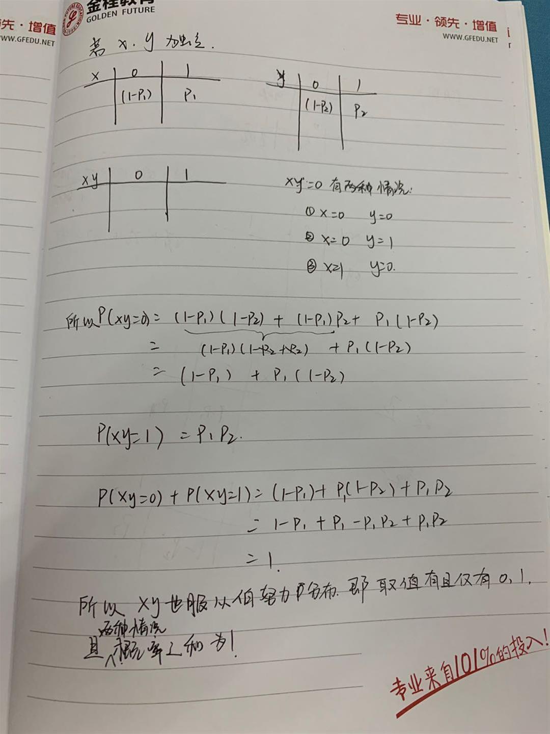 老师,第5题这个解法,我觉得是用的伯努利分布的期望E(X)=p来求解的,那后面用E(XY)去求p (XY)是不是也是建立在XY是一个伯努利分布的基础上呢?两个伯努利随机变量的乘积依然是伯努利随机变量吗?