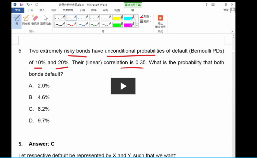 同学你好,是的,E(xy)就相当于P(xy)。可以把E(xy)理解为x和y同时违约的概率期望值。如果x和y相互独立的情况下,xy是服从伯努利分布的,具体证明可以参考下图。但如果不独立的话,情况就很复杂了,需要涉及的知识点远超FRM的考试,有兴趣可以自行探索。