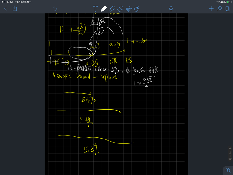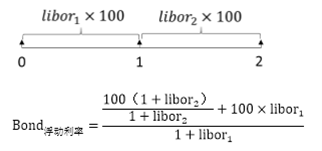 要算浮息债的价值,就是未来现金流求和,在这里不能把2时刻的现金流直接折现到0时刻,因为在0时刻投资者不知道投资者2时刻支付的现金流是多少,投资者只有在1时刻才能知道,所以,直接计算期初价值是不现实的,投资者在计算浮息债价值的时候,要用一个迂回的方式,先折到1时刻,在1时刻的时候投资者可以知道1-2时刻的利率,再加上1时刻的利息现金流,再折到0时刻,所以浮息债的价值计算,是用先折一期再折一期的方式计算出来的,一般用一般复利来进行计算。假如说投资者现在要计算浮息债0时刻的价值,浮息债的价值:最终算出来就是100。