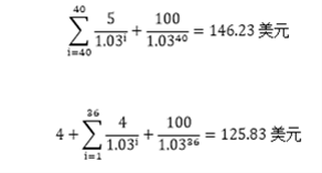 ,假定某债券的息票率为8%,债券期限为18年零4个月。为了计算转换因子,假定债券的期限为18年零3个月。将所有息票支付的现金流以年率(半年复利一次)贴现到3个月后的时间上,债券价格为:图第二个公式
