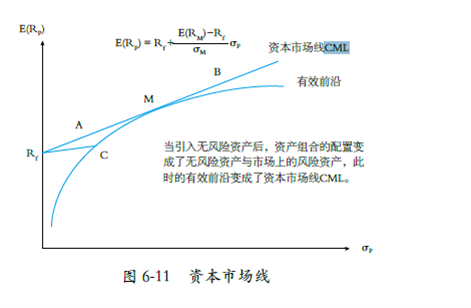 附图中就分别是sml和cml以及efficient frontier,其中sml就是capm的图形表现形式,最小方差前沿上半部分的那一段曲线就是有效前沿,而cml就是无风险资产和有效前沿上的市场组合连接的直线。