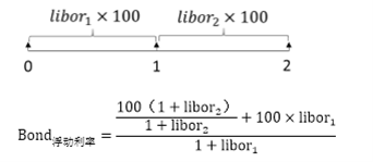 要算浮息债的价值,就是未来现金流求和,在这里不能把2时刻的现金流直接折现到0时刻,因为在0时刻投资者不知道投资者2时刻支付的现金流是多少,投资者只有在1时刻才能知道,所以,直接计算期初价值是不现实的,投资者在计算浮息债价值的时候,要用一个迂回的方式,先折到1时刻,在1时刻的时候投资者可以知道1-2时刻的利率,再加上1时刻的利息现金流,再折到0时刻,所以浮息债的价值计算,是用先折一期再折一期的方式计算出来的,一般用一般复利来进行计算。假如说投资者现在要计算浮息债0时刻的价值,浮息债的价值: