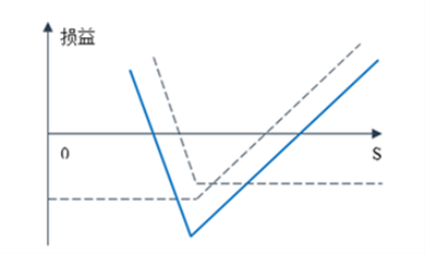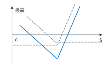 序列组合(strip)通过买入两个看跌期权,买一个具有相同执行价格的看涨期权构造。如图1。标的资产价格上涨的话,是涨一美元,赚一美元的。如果标的资产价格下降的话,是跌一美元,赚两美元的。赌的是波动,但是在标的资产价格下跌的时候赚的更多。是一个偏跌式的策略。如图1
