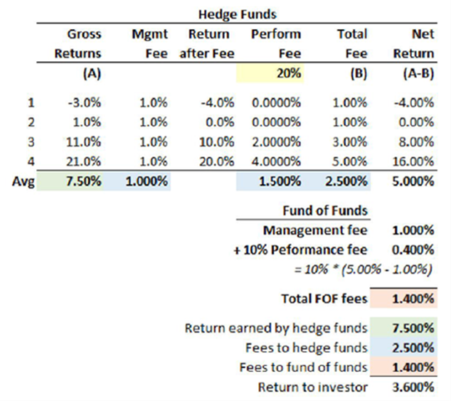 总对冲基金的费用:Total hedge fund fees=1.0% management fee+1.50% (average)performance fee=2.50%,