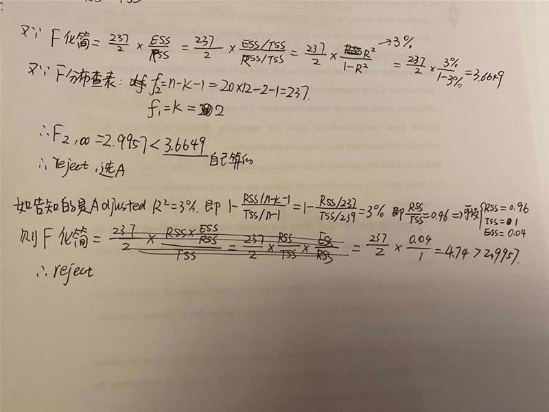 老师,39题,老师后来说可以自己再算下如果告诉adjuated r2是3%,我算了下你看看对不对,f=4.74,然后也按照f2,∞=2.9957比较(因为也是k=2),是拒绝原假设。谢谢