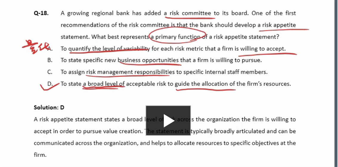 同学你好,不好意思,我仔细看了一下选项,这道题目应该是选D,A前面是对的,但是后面说的是each risk metric,risk appetite是在一个比较广泛的层面上, board level,不会精确到每一个风险度量的。所以应该选D。