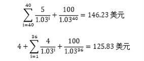 作为以上规则的第2个实例,假定某债券的息票率为8%,债券期限为18年零4个月。为了计算转换因子,假定债券的期限为18年零3个月。将所有息票支付的现金流以年率(半年复利一次)贴现到3个月后的时间上,债券价格为:如图第二个公式