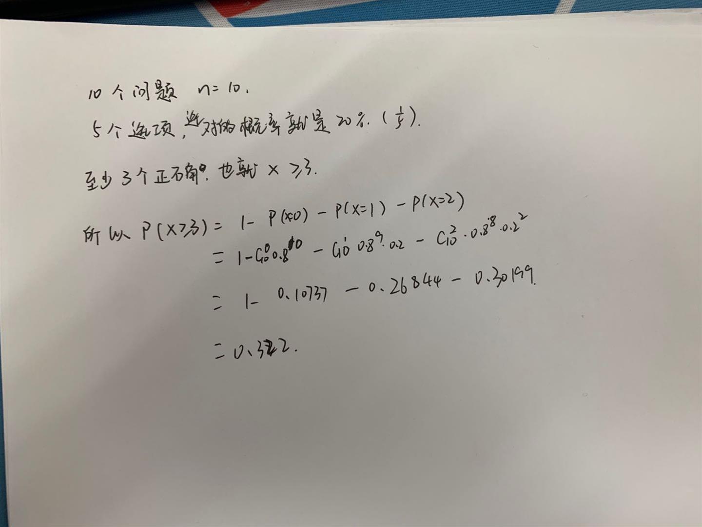 0.8就是选错的概率呀,5个选项里只有一个选项是正确的,所以选对的概率是20%,选错的概率就是80%, 也就是0.2和0.8的由来啦