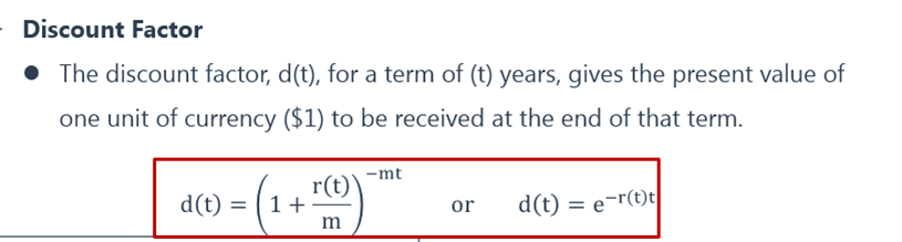 表示未来的1块钱今天值多少钱。表达式为d(t),比如d(0.5)=0.97557,表示0.5年后的1块钱今天值0.97557元,折现因子可以直接给债券定价。比如现在有债券A,3个月后要支付105元,那么债券A现在的价值为105×三个月期的折现因子。