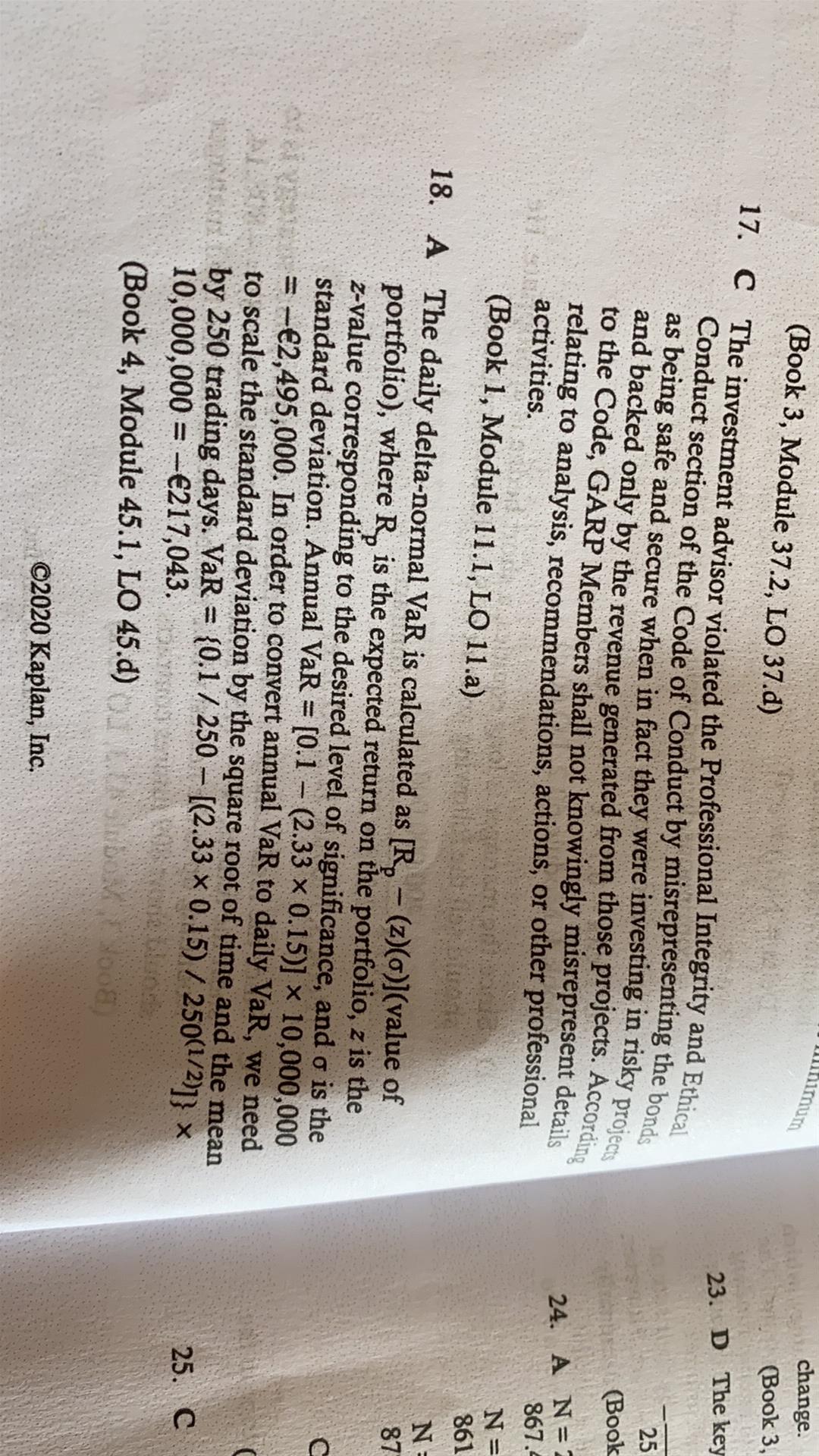 这道题里,均值不为0 ,所以我们不能直接用平方根法则,只能先把年化的收益和波动率调整到daily的维度,年化的均值除以252变成daily的,年化的波动率除以根号252变成daily的,然后再带入到VAR的公式里面去算就可以了