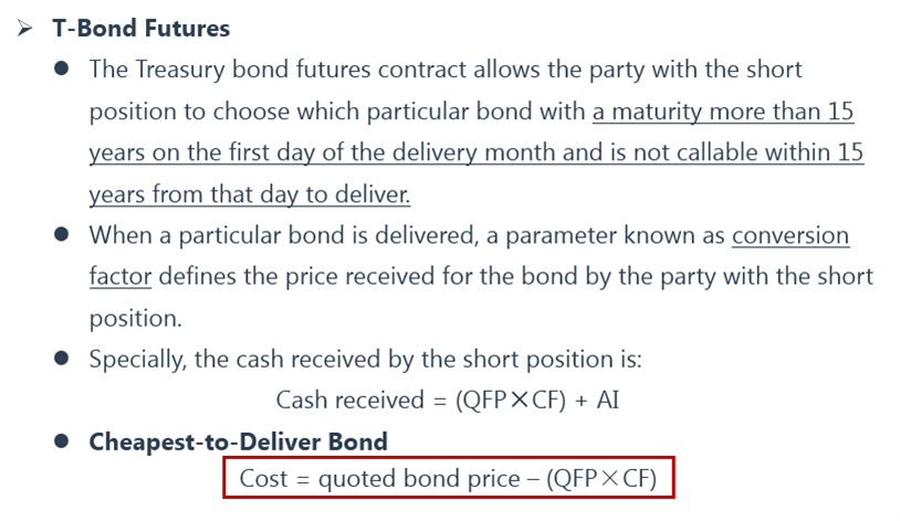 对于空头方来说,交割的是债券,收到的钱=(最新成交价格×转换因子)+应计利息