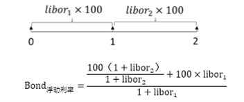 要算浮息债的价值,就是未来现金流求和,在这里不能把2时刻的现金流直接折现到0时刻,因为在0时刻投资者不知道投资者2时刻支付的现金流是多少,投资者只有在1时刻才能知道,所以,直接计算期初价值是不现实的,投资者在计算浮息债价值的时候,要用一个迂回的方式,先折到1时刻,在1时刻的时候投资者可以知道1-2时刻的利率,再加上1时刻的利息现金流,再折到0时刻,所以浮息债的价值计算,是用先折一期再折一期的方式计算出来的,一般用一般复利来进行计算。假如说投资者现在要计算浮息债0时刻的价值,浮息债的价值: