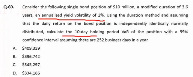 以百题60题为例,这道题给出是年化的波动率,但是题目让我们算的是10天的VAR值,所以我们先把年化的波动率除以根号252,转化成1天的,接着再乘以根号10,转化成10天的波动率,来计算VAR值的,其他的题意以此类推,就不重复说啦