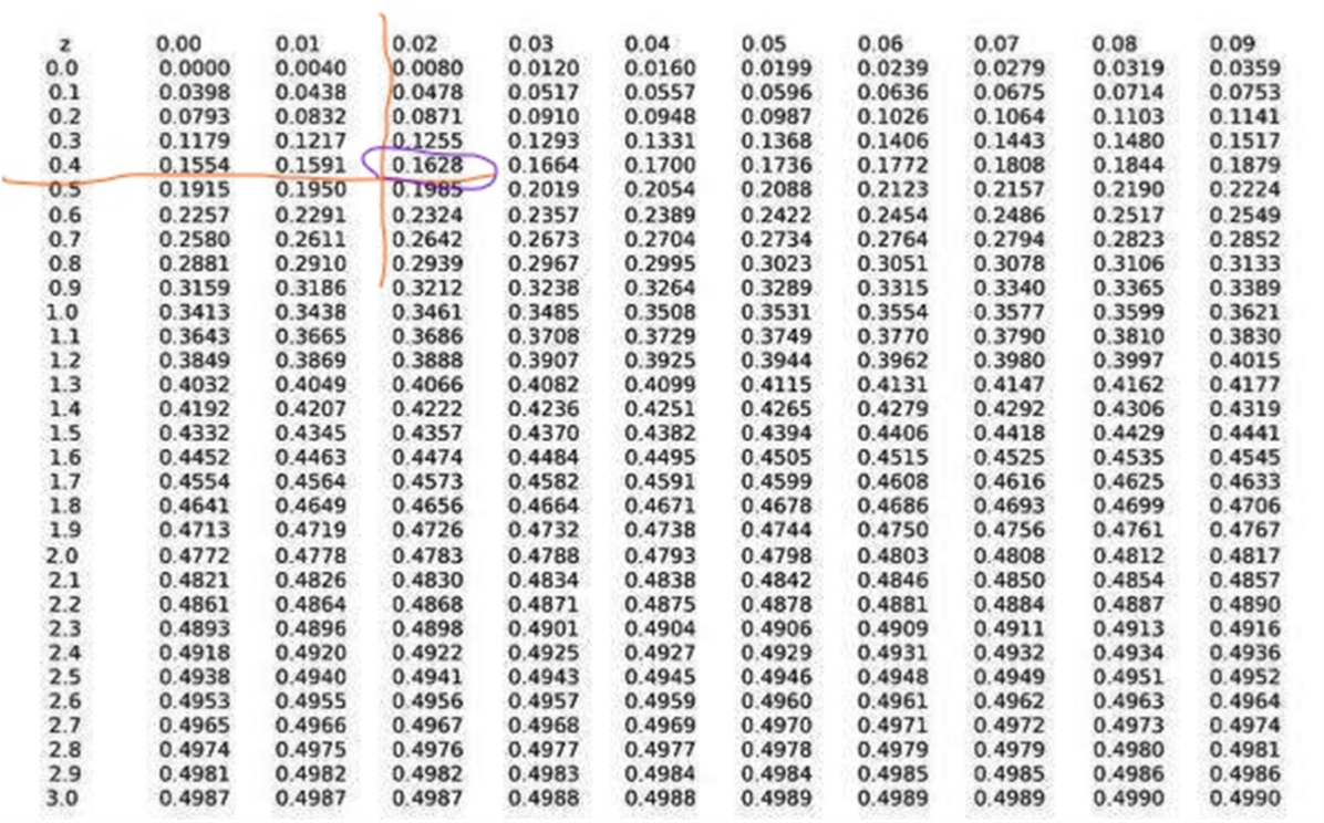 关于正态分布的查表,请看如下图所示的正态分布表,蓝色笔圈出来的0.1628,就表示正态分布图上X小于0.42的概率是0.1628,首先横着看,从0.1628在一条线上的是0.4,再纵着看,和0.1628在一条线上的是0.02,0.4和0.02组合在一起就是0.42,对于其他的也是如此,比如0.1985就表示正态分布图上X小于0.52的概率是0.1985,你可以自己多试着看几个(#^.^#)