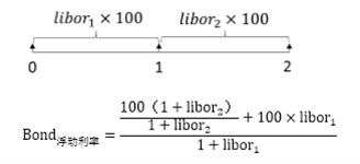 要算浮息债的价值,就是未来现金流求和,在这里不能把2时刻的现金流直接折现到0时刻,因为在0时刻投资者不知道投资者2时刻支付的现金流是多少,投资者只有在1时刻才能知道,所以,直接计算期初价值是不现实的,投资者在计算浮息债价值的时候,要用一个迂回的方式,先折到1时刻,在1时刻的时候投资者可以知道1-2时刻的利率,再加上1时刻的利息现金流,再折到0时刻,所以浮息债的价值计算,是用先折一期再折一期的方式计算出来的,一般用一般复利来进行计算。假如说投资者现在要计算浮息债0时刻的价值,浮息债的价值:最终算出来就是100