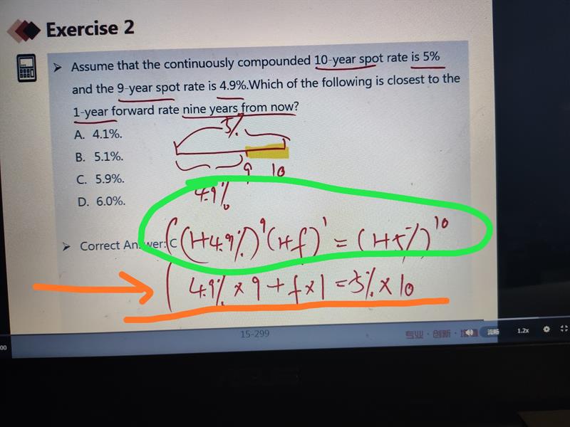 老师, 我多了一个疑问, 既然题目中提到了是连续复利, 按理不是应该直接使用橙色箭头指向的公式吗?请问为何能够用得上绿色画圈这个公式?该公式难道不是普通复利才能使用的吗?