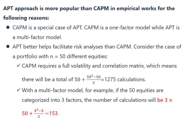 同学你好,example 3问的是有多少covariance,两两资产之间就有一个covariance,所以是80*79/2,example 4问的是有多少计算方式,从例题4中已经明确说了是四因素模型,所以用的APT模型的计算方法而不是CAPM模型的计算方法一共100家公司,所以是100*4,再考虑四个因素两两之间的关系,所以是406。