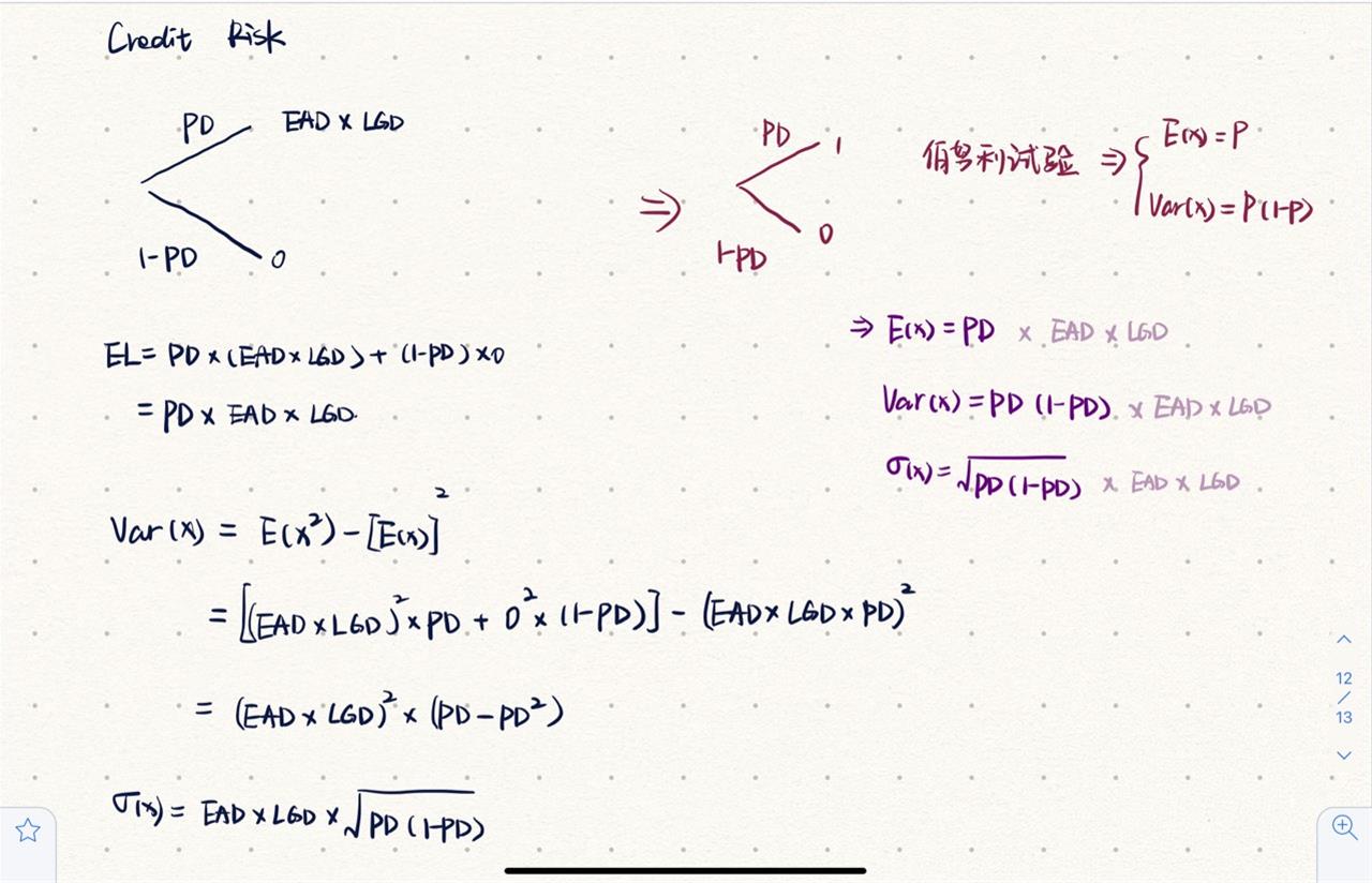 同学你好,违约事件相当于一个伯努利试验:违约概率是PD,损失1,不违约概率是1-PD,损失0。可直接带入伯努利试验的方差