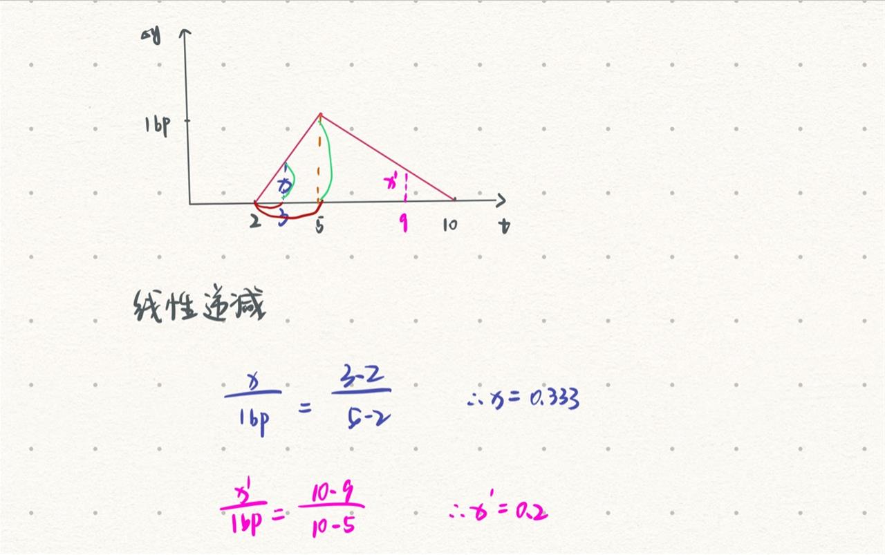 同学你好,关键利率的改变只影响到相邻的关键利率,且线性递减。