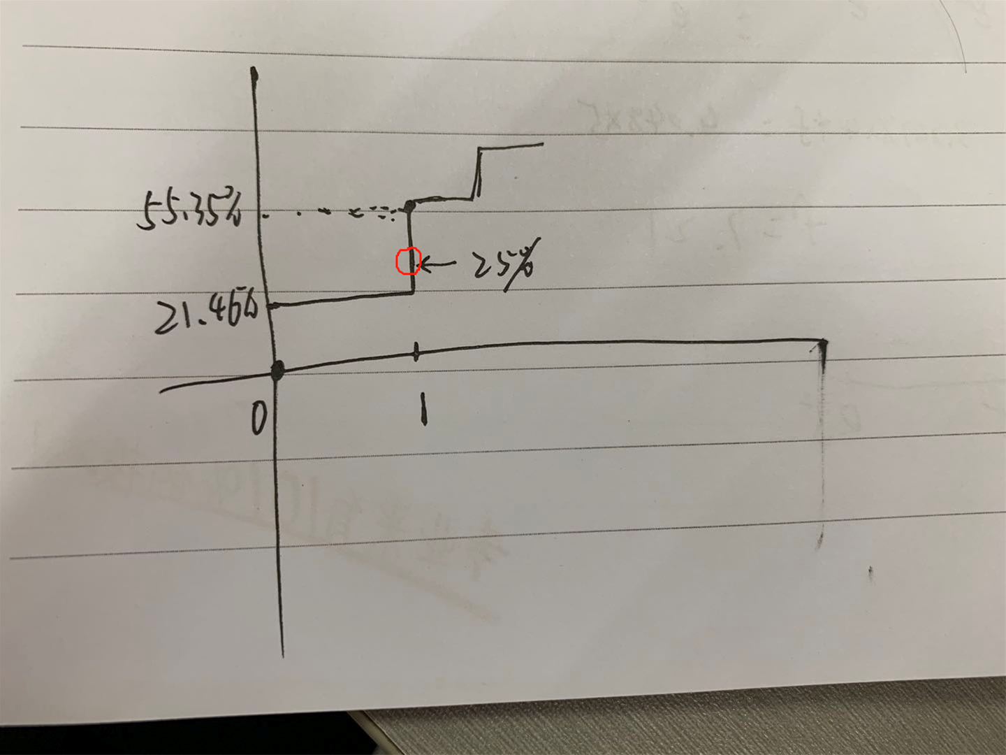 同学你好,x=0累积的概率是21.46%,到1的时候就陡然累积到55.35%。按照咱们讲义上CDF的画法,25%应该位于1对应的这条竖线上的。见附图。