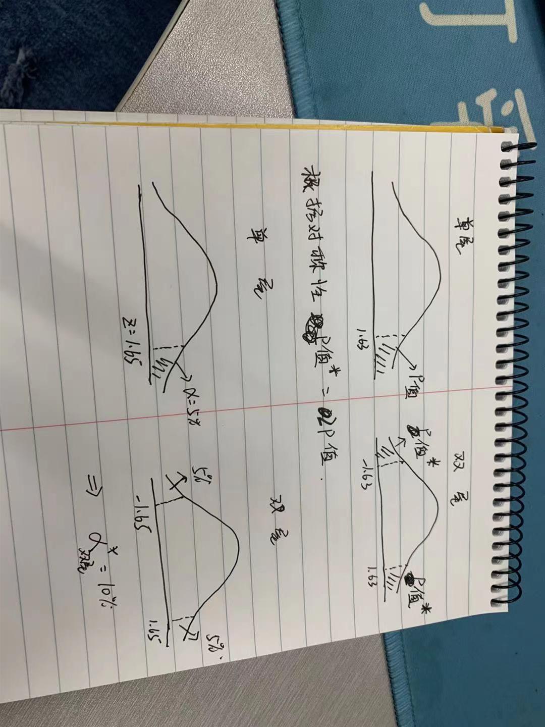 p值就是指统计量对应的拒绝域的概率,举个例子,t-stat=1.63, 那么p值就是指超过1.63对应的尾部概率;跟alpha要稍微区分一下,alpha是超过关键值对应的尾部概率,详细见附图。