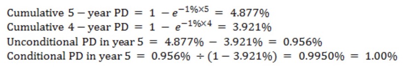 对于条件概率:P(A|B)=P(AB)/P(B). 这里A指的是第五年违约,B是前四年不违约。P(AB)表示的就是在P(前四年不违约且第五年违约的概率),而第二行公式求的其实就是这个,非条件违约概率就是单看一年的违约概率,这个概率在算的时候其实是默认前面年份不违约的,相当于是一个联合概率了。所以用第五年的非条件违约概率P(AB)除以前四年不违约的概率P(B)。