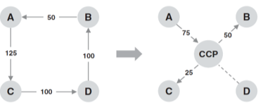 完全清算(complete clearing),是清算最高层次。这里就涉及一个专门的参与主体叫做清算所(clearing house)。这个中央的参与主体就会把所有人的交易,变成和这个中央参与主体之间的交易,如图2