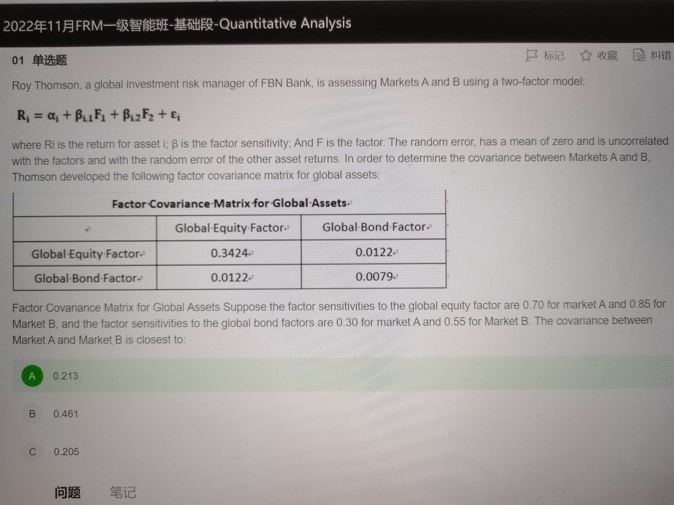 这个题目大致意思就是:A和B市场用两因子模型来进行解释,两个因子分别是equity和bond。而equity这个因子对于A市场来说,敏感系数Beta(E,A)=0.7,其实也就是对于A来说,equity这个解释变量前面的系数是0.7。Beta (B,A)=0.3,也就是对于A市场来说,bond这个解释变量前面的系数是0.3,所以A市场=0.7equity+0.3bond。类似的,对于B市场,也是用equity和bond两个解释变量来解释,对于B市场,equity前面的系数是0.85, bond前面是的系数是0.55,所以B市场=0.85equity+0.55bond。所以我们求cov(A市场,B市场)就相当于求cov(0.7equity+0.3bond,0.85equity+0.55bond),然后根据公示cov(ax+by,cx+dy)=acVar(x)+bdVar(y)+(ad+bc)cov(x,y)进行化简展开,接来下的步骤就跟解析里一样了。