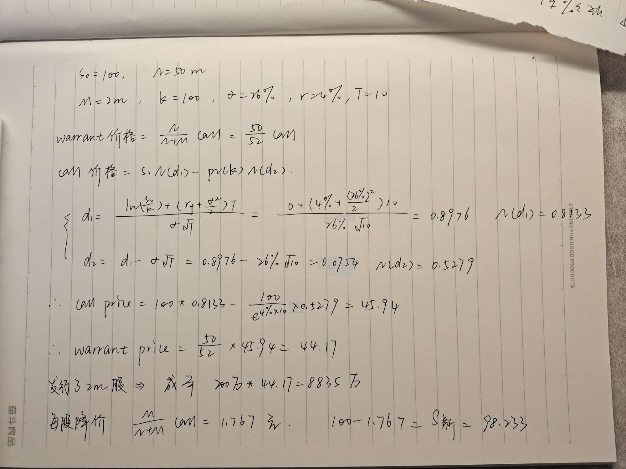 你好同学,期权的BSM价格为$46.00,则公司每项期权的成本为50.0/(50.0 + 2.0)× $46.0 = $44.2308,总成本约为$44.2308 × 200万= $ 8846万。请注意,如果市场认为认股权证发行没有带来任何好处,则市值减少约49.12亿元,每股股价减少约1.77元;也就是说,新股价约为98.23美元。