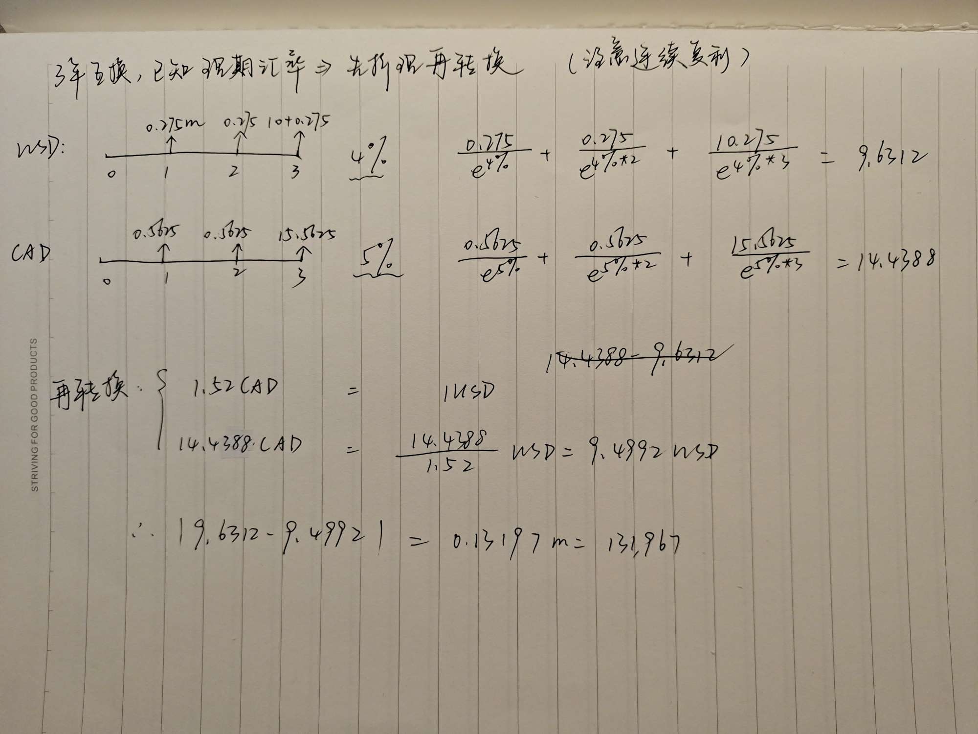 分别计算以下两个债券的价值【未来现金流贴现求和】,减一减就是货币互换的价值。