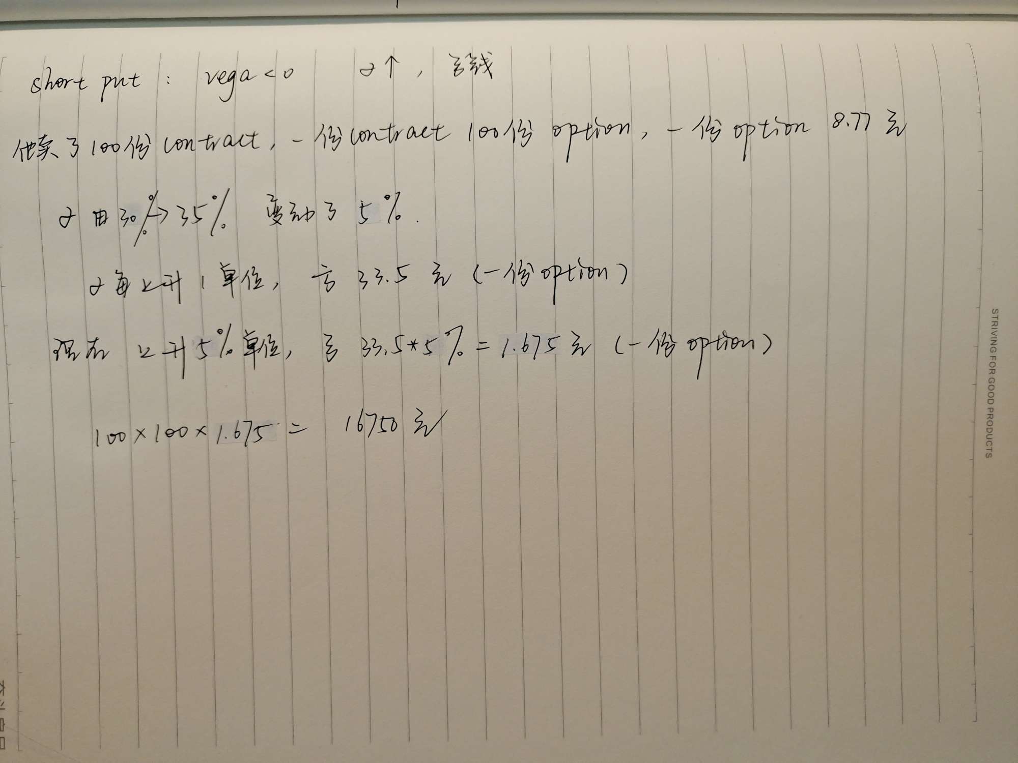 你好同学,Vega为33.50意味着期权的价值将增加,每单位波动率增加33.50美元,其中一个单位是100%。因此,5.0%的波动率增加意味着5.0% × 33.5 = 1.6750美元的变化,但鉴于Patricia持有100个合约的空头,她的估计损失是5% × 33.50 × -10,000 = - 16750美元。