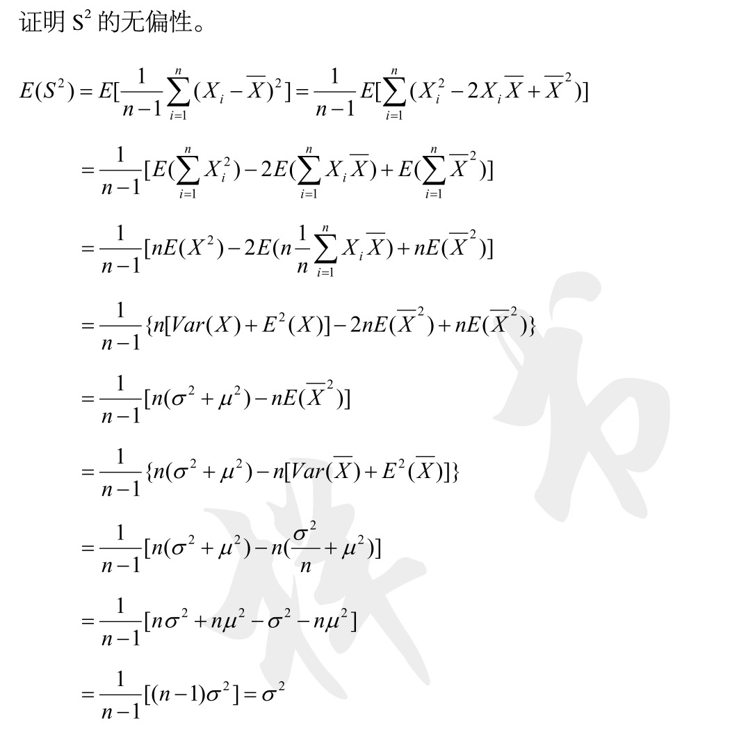 其中,样本均值具有无偏性,证明见附图1;样本方差不具有无偏性,需要调整到S^2,也就是分母是除以n-1而非除以n,才具有无偏性,证明见附图2. 证明不需要掌握,知道这两个结论即可。