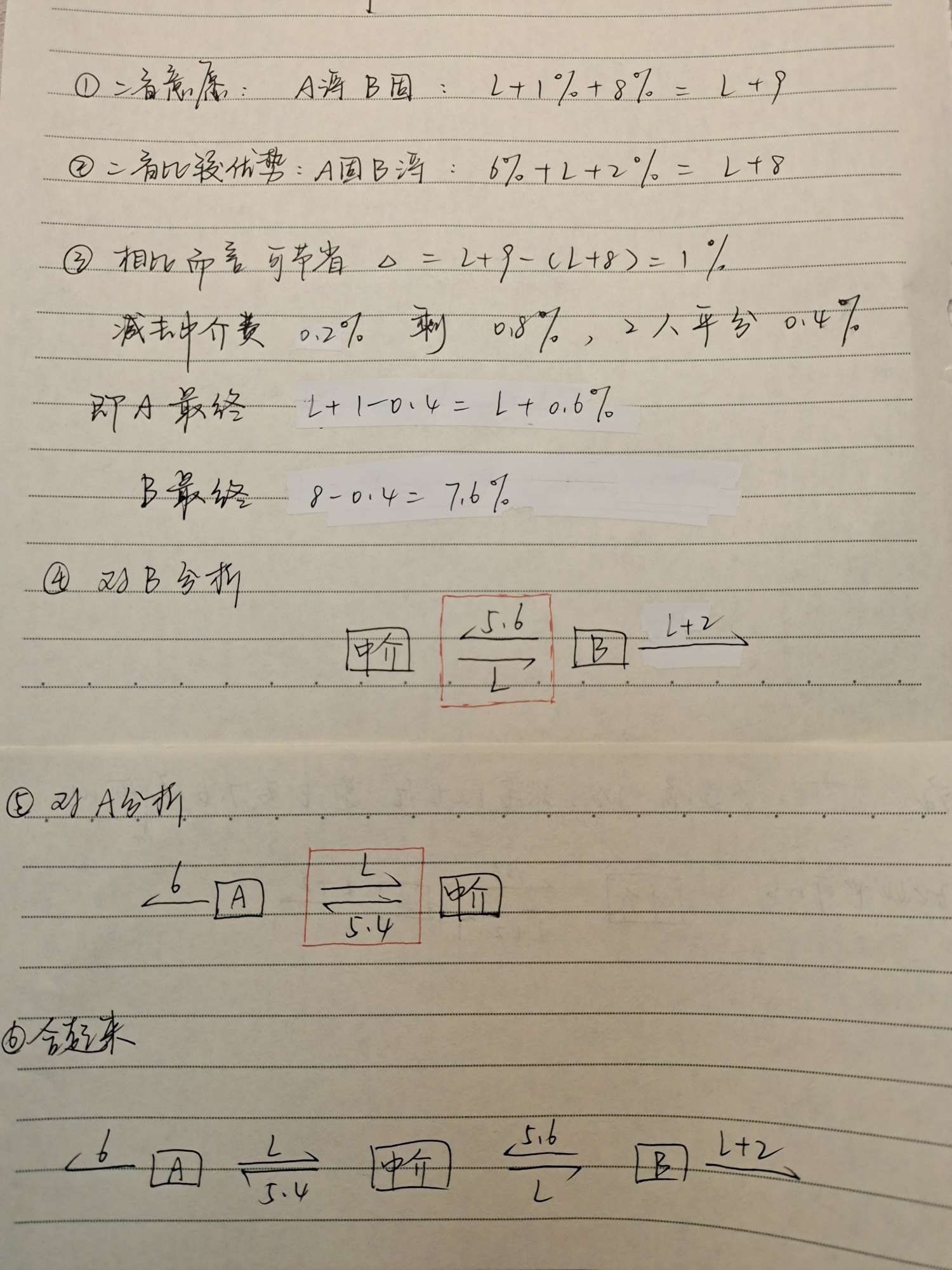 落泪了我一点也听不懂,麻烦老师再给我仔细讲解一下。为什么A要借的是浮动,图片里面,A支出了6%是帮B借的,因为B想要固定。那为什么中介还给A 5.4%的固定,然后A怎么还要给中介一个Libor讷 是什么意思呀?5.4怎么算出来的。还有B给中介的5.6%根中介给B的libor我也不明白为啥。