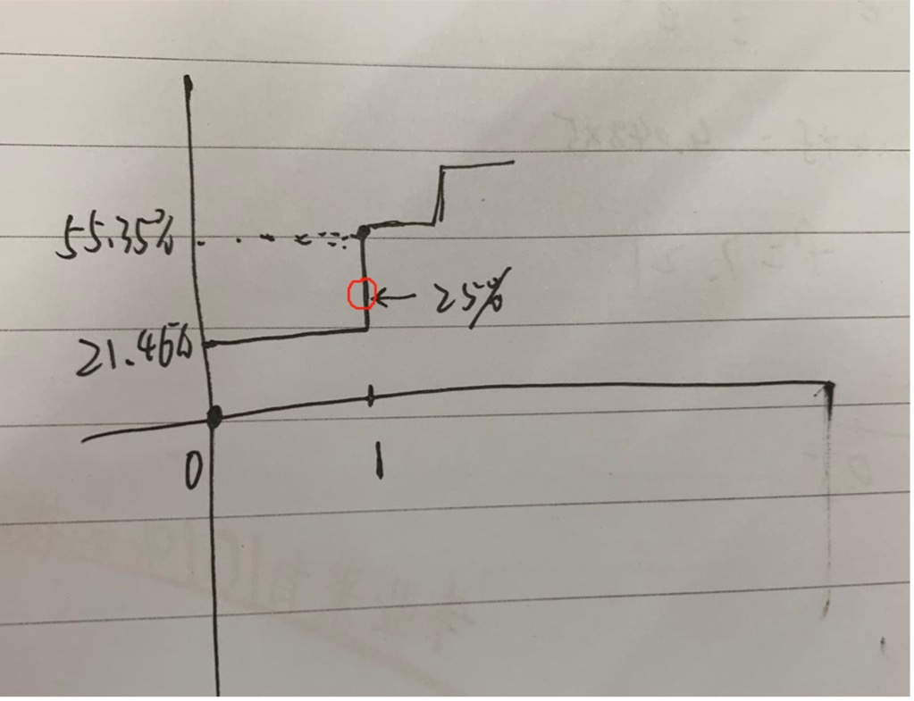 题目问的是累积25%对应的发生次数是几次。x表示发生次数,x=0累积的概率是21.46%,到1的时候就陡然累积到55.35%。按照咱们讲义上CDF的画法,25%应该位于1对应的这条竖线上的。