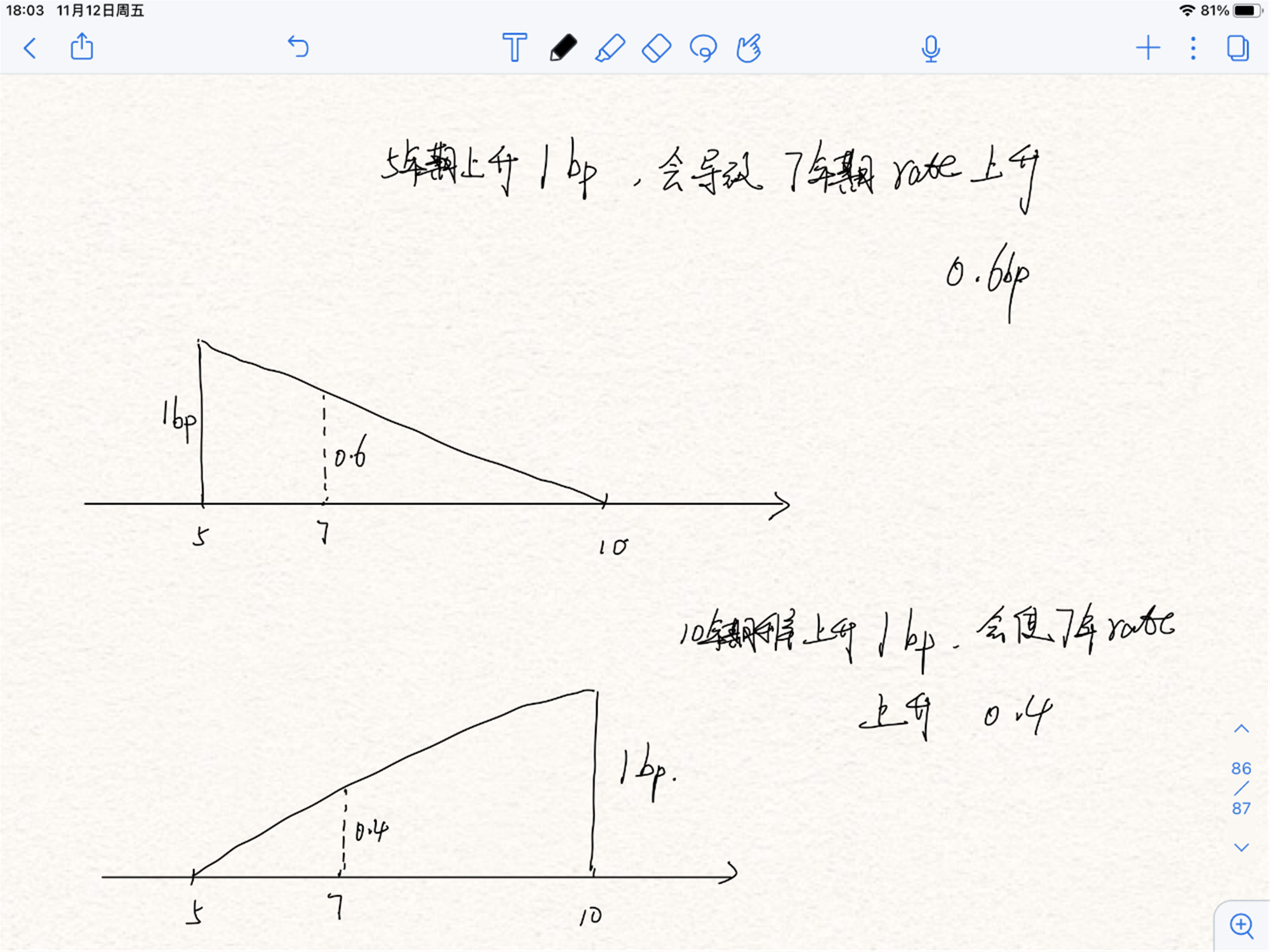 当5年期关键利率上升1bp,根据相似三角形,我们能算出7年期的利率会上升0.6bp.