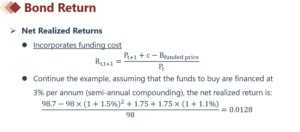同学你好,所谓net realized return,其实就是债券给你赚的钱,再扣减成本,最后除以债券价格。