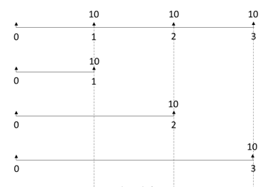 假如现在有一家原油的供给商,在未来的三年里,都需要对外出售原油合约,它会担心油价下跌,可以通过一些远期或者期货合约进行对冲,因为未来有多笔头寸,投资者就可以采用不同方式进行对冲,一种方式是完全的对冲,分别建立三份合约,每份合约针对每笔交易来进行对冲,比如说投资者每一年要有10桶油的支出,第一笔对冲就是一年后10桶油的期货合约对冲,第二笔对冲就是两年后10桶油的对冲,第三笔对冲就是三年后10桶油的对冲,这种对冲方式叫做一对一对冲,(strip)。如图1