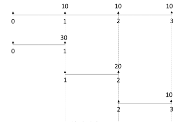 但是这种对冲有一个问题,当需要一些长期合约的时候,比如说这里不是三年,是10年的话,那就可能就需要一份长达10年的合约进行对冲,通常短期期货市场的流动性是非常好的,10年期的期货合约投资者几乎是找不到的,因此,一对一对冲(strip hedge)可能因为流动性的问题,没有办法达成,因此投资者可能用另外一种方式来替代一对一对冲,另外一种方式就是滚动对冲,同样我们一起来考虑一下未来三年30桶油的滚动对冲(stack and roll),stack是堆在一起的意思,也就是用短期的期货合约堆积起来,一段一段时间对冲长期的头寸,它未来每一个短期都是用剩余期间所有头寸堆在一起进行对冲的,比如在这个例子当中,未来一共是30桶油的价格风险,对冲的时候,一开始第一年,多头30桶油的一年期合约(之所以30份,是因为要对冲这30桶油在0~1时刻的价格变动),到期的时候平仓,再新建立一份包含20桶油的合约,然后等待一年平仓,接着再建立一份10桶油的一年期合约,这种对冲就叫做滚动对冲(stack hedge)。如图2