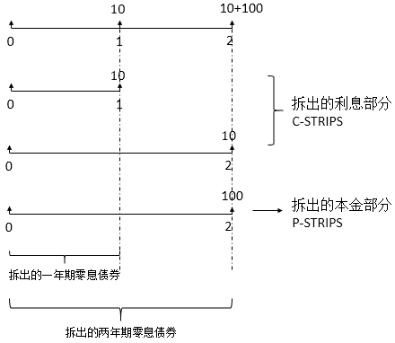 因为美国国债的零息债券只有一年以内的零息债券,两年以上的债券都是付息债券,而在金融市场上,大多数投资者偏好零息债,因为它在风险管理中运用较多,不需要考虑再投资风险,可以根据投资者所需要的现金流,用零息债券组合定制出相应的金融工具。既然金融市场上有这个需求,慢慢就有人想办法满足这种需求。投行发现了这个商机,构造出长期限的零息债券供应。具体做法是:购买付息债券,然后进行剥离的操作。如图