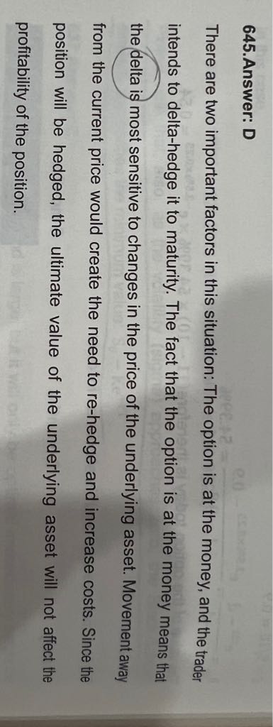 这题希望保持一个delta neutral的组合,所以delta不变的话,动态对冲的成本肯定是最少的,ABCD4个选项,前面3个都会引起股价的变化,接着引起delta的变化,只有D选项,股价在执行价格附近晃动的话,可以近似的认为股价是保持不变的,delta也是相对稳定的。所以对冲成本最少。