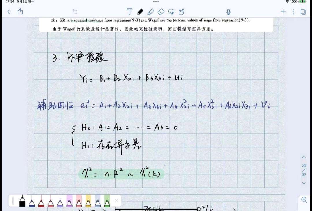 他的想法就是如果残差平方和与X之间是没有关系的,那么它应该与X1、X2、X1的平方、X2的平方以及X1X2都没有明显关系。那我们就用观察到的数据来对他们做一个回归分析,用前面学过的最小二乘法得出他们的回归方程。然后再分析这个回归方程上述各个变量前的系数,如果没有明显关系,那么这些系数应该很接近于0,所以就有了下面的white test。