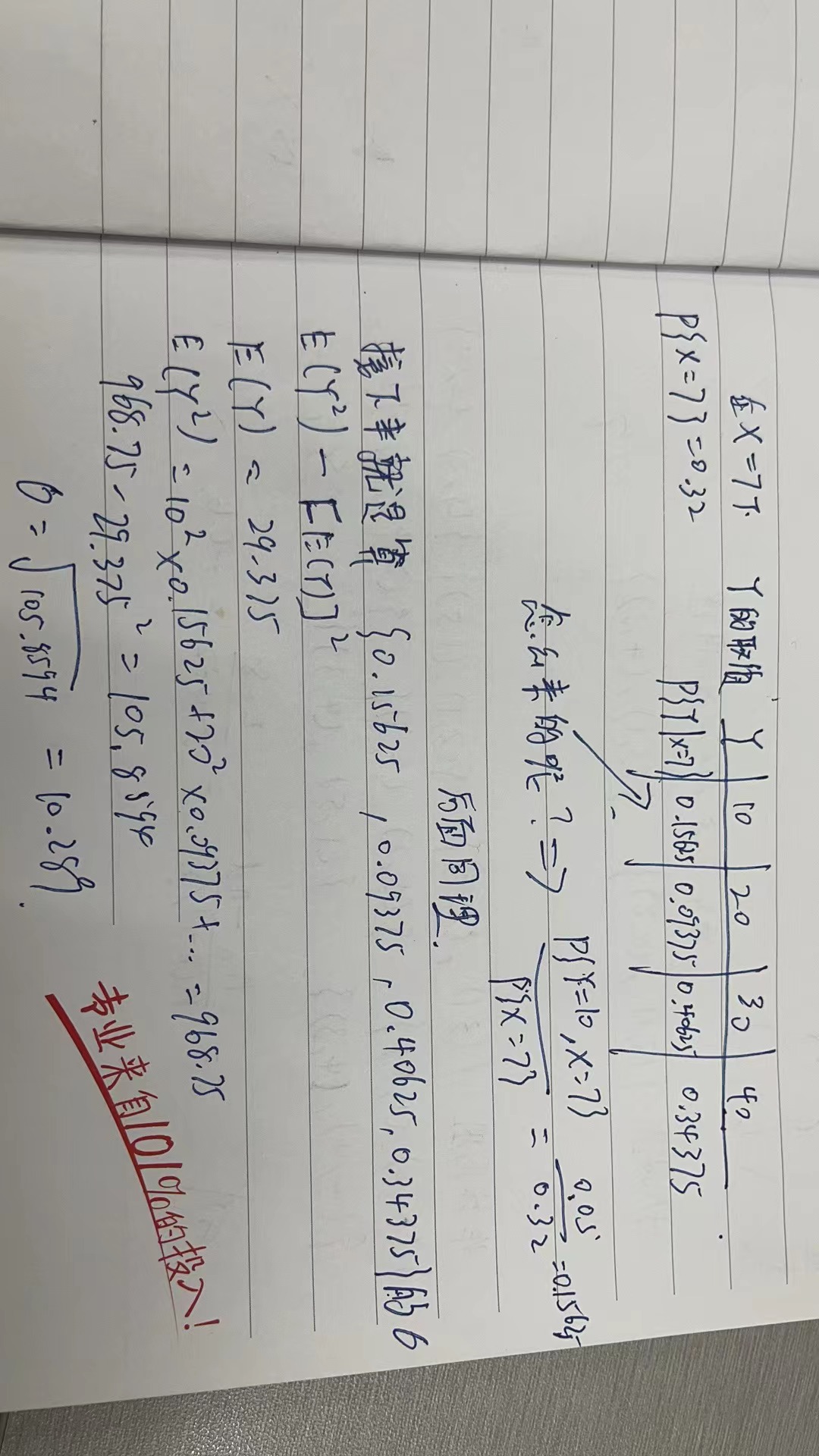 同学您好,这道题求的是条件标准差,在X=7的情况下,Y的条件标准差。遇到这种题我们要先求条件概率,就是在X=7的情况下Y的条件概率然后再去算条件标准差,具体步骤看一下图片哈