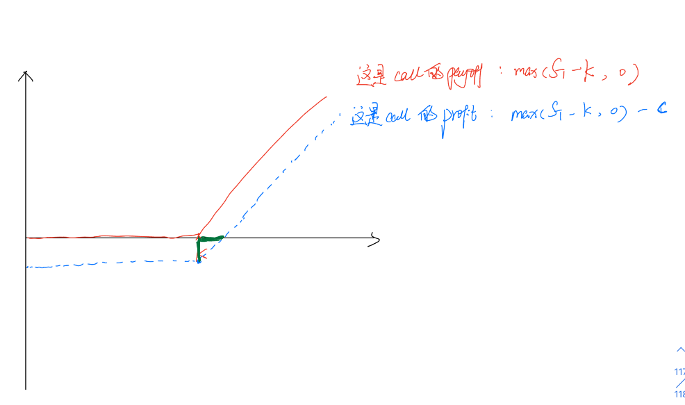 这个内容其实没什么难度,就是看涨期权的payoff整体向下平移“期权费”个单位,就得到了profit。