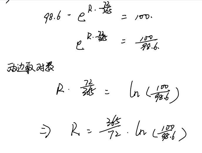 老師第四條這裏e^rx(72/365)=100/98.6是那一條公式?另外這裏的答案有兩個計算方法都不太明白,可以解釋一下嗎?