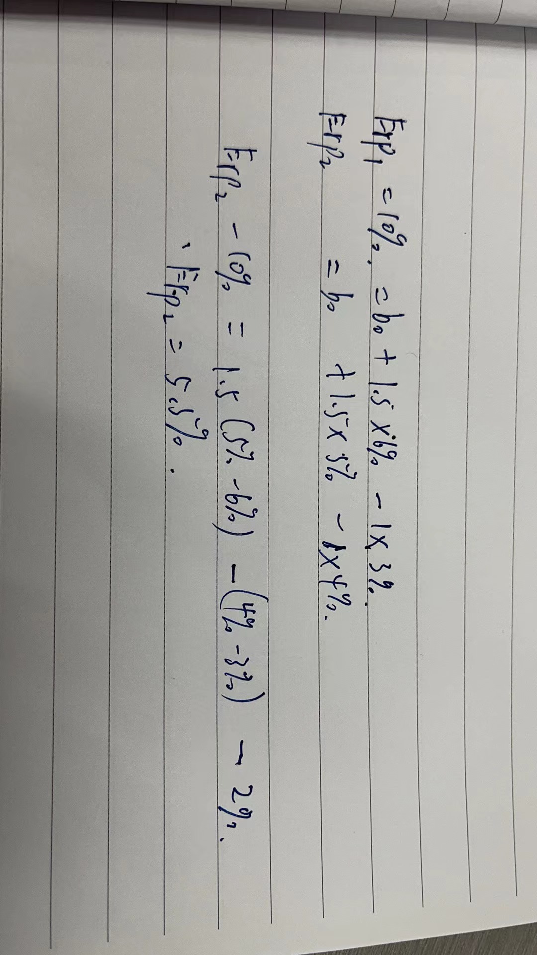 同学您好,把变化前的式子列出来然后再把变化后的式子列出来,其中就一个截距项是不知道的,只要把两个式子相减,但别忘了有一个组合自己特定的风险-2%要减去,最后就可以得出答案了哈